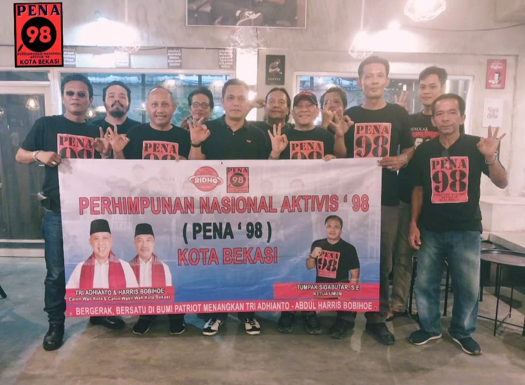 Mantan Aktivis 98 yang tergabung dalam Perhimpunan Nasional Aktivis ’98 (PENA ’98) Kota Bekasi yang dihadiri koordinator masing – masing kecamatan se Kota Bekasi secara resmi mendeklarasikan dukungannya untuk pasangan Calon Wali Kota dan Wakil Wali Kota Bekasi Tri Adhianto – Abdul Harris Bobihoe Periode 2024 – 2029 di Cafe Black’s Cofee, Kel. Teluk buyung, Kec. Bekasi Utara. Rabu, ( 16/10/2024)