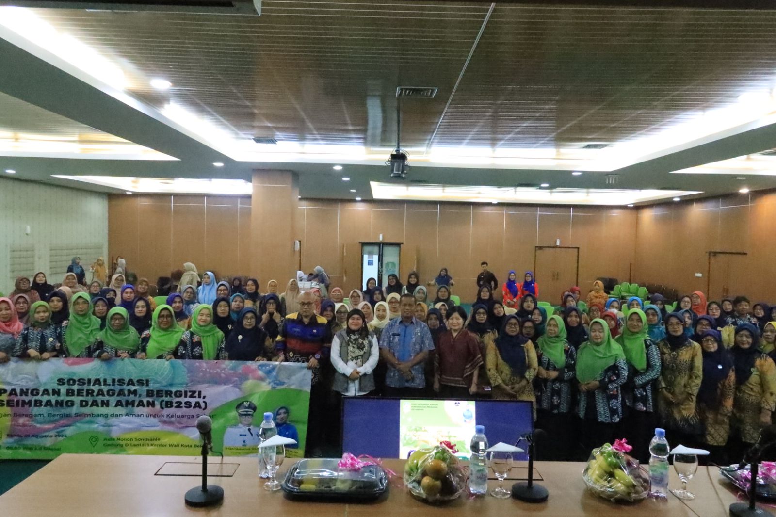 Pemenuhan pangan sangat penting sebagai komponen dasar untuk mewujudkan sumber daya manusia yang berkualitas. Dengan mengonsumsi makanan sehari-hari yang beranekaragam, kekurangan zat gizi pada jenis makanan yang satu akan dilengkapi oleh keunggulan susunan zat gizi jenis makanan lain, sehingga diperoleh masukan zat gizi yang seimbang. Dalam rangka meningkatkan kualitas konsumsi pangan dan gizi masyarakat, Pemerintah Kota Bekasi melalui Dinas Ketahanan Pangan, Pertanian dan Perikanan Kota Bekasi menggelar kegiatan Sosialisasi Pangan Beragam Bergizi Seimbang dan Aman (B2SA) kepada PKK Kota Bekasi bertempat di Aula Nonon Sontanie, Jum’at ( 01/08/2024 )