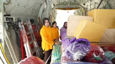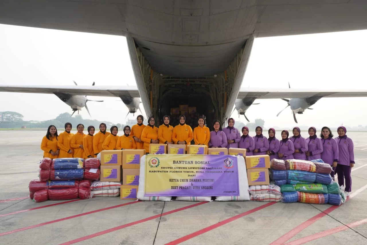 Ketua Umum (Ketum) Dharma Pertiwi (DP) Ny. Evi Agus Subiyanto sekaligus Ketum Ikatan Kesejahteraan Keluarga TNI (IKKT) Pragati Wira Anggini (PWA) menyerahkan Bantuan Sosial (Bansos) untuk masyarakat terdampak erupsi gunung Lewotobi Laki-Laki di NTT kepada Danskadron 31 Letkol Pnb Chandra Danang Jaya, bertempat di Baseoff Lanud Halim PK, Jakarta Timur, Jumat (15/11/2024).