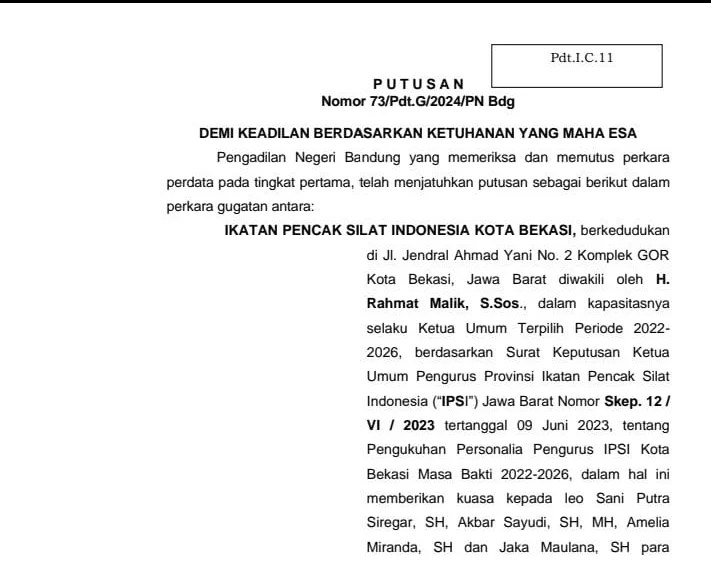Majelis Hakim Pengadilan Negeri (PN) Bandung akhirnya mengabulkam gugatan yang diajukan Ketua Umum IPSI Kota Bekasi Rahmat Malik melalui kuasa hukumnya. Hakim ketua Syarip, SH, mementahkan penerbitan Surat Keputusan (SK) Nomor Skep 22/XII/2023 IPSI Kota Bekasi periode 2023-2027.