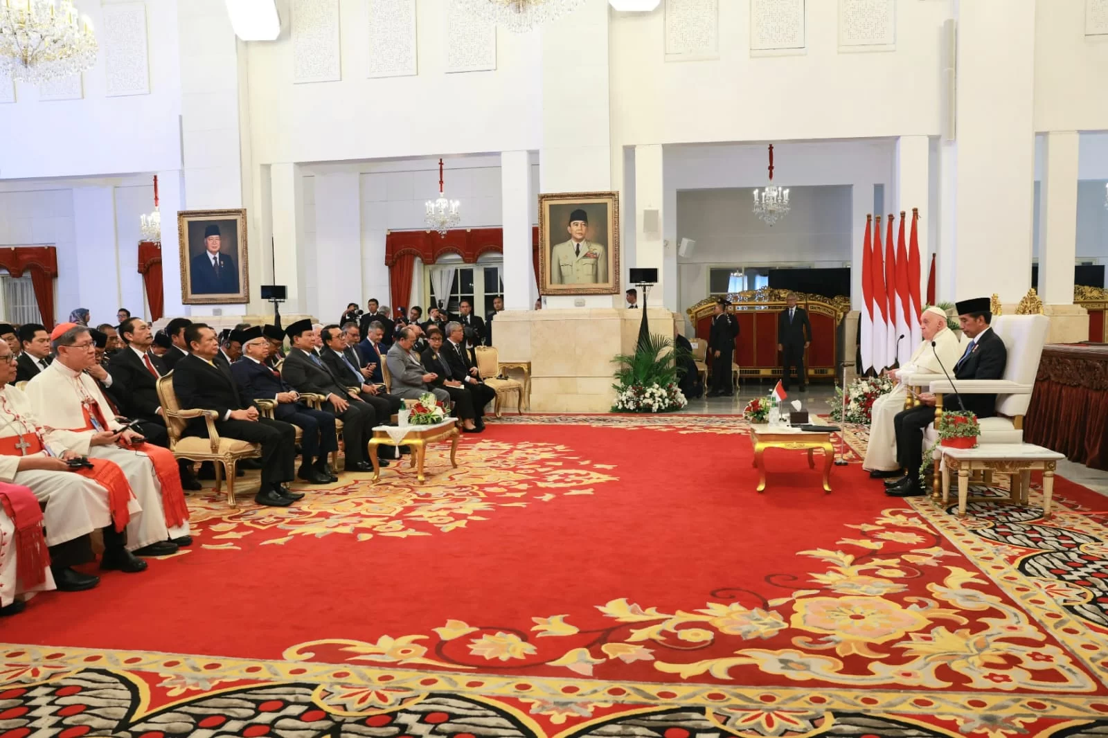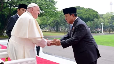 Menteri Pertahanan RI (Menhan RI) Prabowo Subianto mendampingi Presiden Joko Widodo dalam kunjungan Pemimpin Tertinggi Gereja Katolik Sedunia dan Kepala Negara Vatikan, Yang Teramat Mulia Sri Paus Fransiskus pada hari Rabu (4/9/2024), Istana Merdeka, Jakarta.