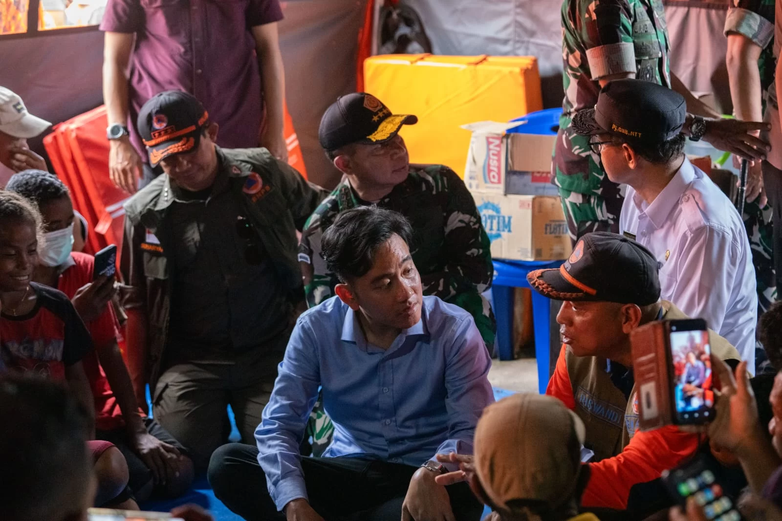 Panglima TNI Jenderal TNI Agus Subiyanto mendampingi Wakil Presiden RI Gibran Rakabuming Raka dalam kunjungan kerjanya untuk meninjau posko pengungsian korban erupsi Gunung Lewotobi Laki-Laki di Flores Timur, Nusa Tenggara Timur, Kamis (14/11/2024).