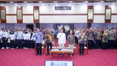 Sekda Kota Bekasi didampingi Kepala Dinas Kesehatan Kota Bekasi, Tanti Rohilawaty, Kepala Dinas Kependudukan dan Catatan Sipil Kota Bekasi, Taufik Rachman dan Kepala BPJS Kesehatan Kota Bekasi, Irmajanti Lande Batara