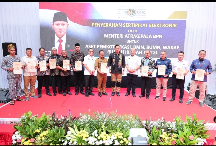 Adapun 12 Sertipikat Tanah Elektronik yang diserahkan hari ini terdiri dari 6 sertipikat hasil program Pendaftaran Tanah Sistematis Lengkap (PTSL); 2 Sertipikat Hak Pakai untuk Pemerintah Kota Bekasi dan Badan Kepegawaian Negara; 1 sertipikat tanah wakaf untuk musala; 1 sertipikat rumah ibadah untuk gereja; serta 2 Sertipikat Hak Guna Bangunan (HGB) untuk PT Kereta Api Indonesia dan PT PLN.
