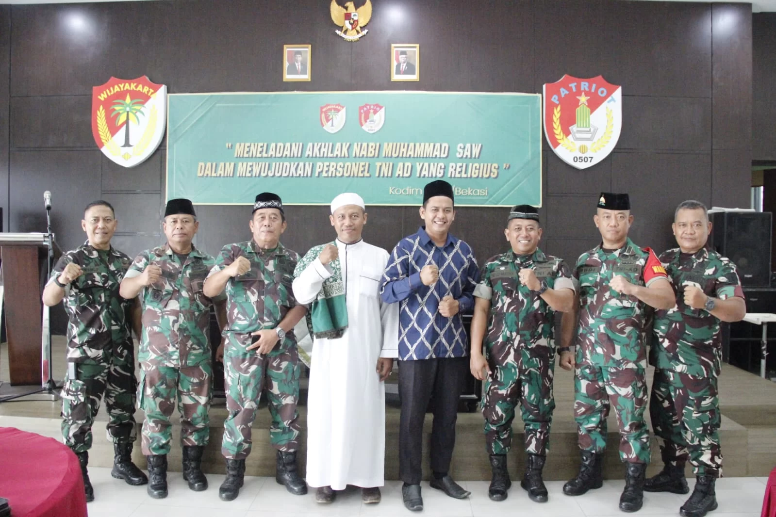 Dalam rangka meningkatkan keimanan dan ketaqwaan kepada Allah SWT dengan meneladani prilaku Rasulullah, Kodim 0507/Bekasi mengadakan peringatan Maulid Nabi Muhammad SAW 1446 H di Aula Makodim 0507/Bekasi, Jalan Veteran no.60, Kelurahan Margajaya, Kecamatan Bekasi Selatan, Kota Bekasi, dengan tema “Meneladani Akhlak Nabi Muhammad SAW Dalam Mewujudkan Personel TNI AD Yang Religius”. Jumat (20/09/2024).