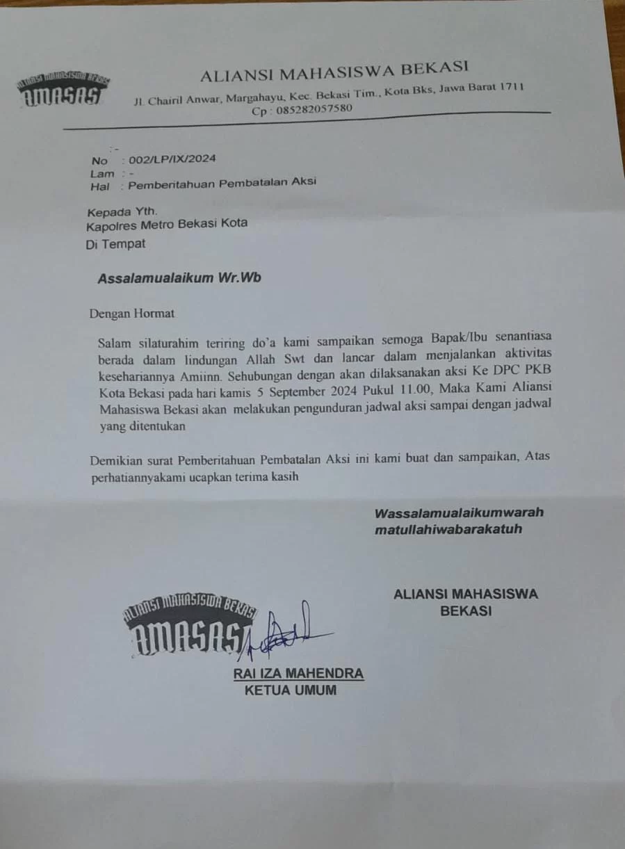 “Maka Kami Aliansi Mahasiswa Bekasi akan melakukan pengunduran jadwal aksi sampai dengan jadwal yang ditentukan. Demikian surat Pemberitahuan Pembatalan Aksi ini kami buat dan sampaikan, atas perhatannya kami ucapkan terima kasih,” tulisnya ditanda tangani langsung Ketua Umum Amasasi Raiza Mahendra.