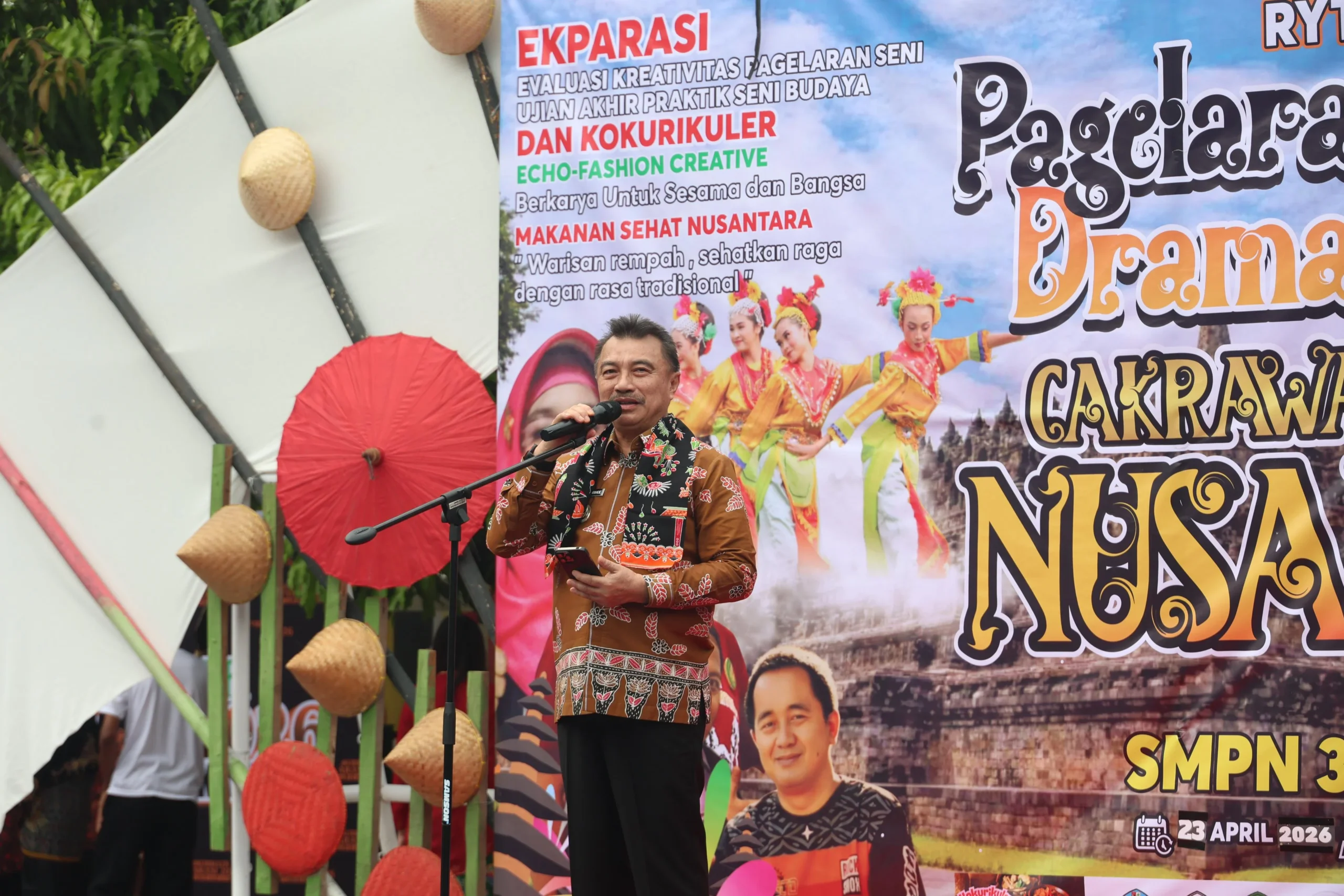 Wakil Wali Kota Bekasi, Abdul Harris Bobihoe, menghadiri pagelaran drama kolosal bertajuk “Cakrawala Budaya Nusantara” yang diselenggarakan di SMPN 38 Kota Bekasi. Kegiatan ini turut dihadiri Plt Kepala Dinas Pendidikan Kota Bekasi, camat, lurah, unsur Forkopimda, para guru, serta orang tua murid.